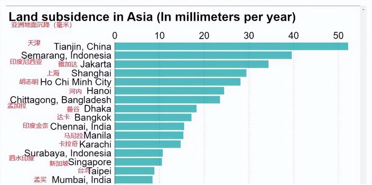 其中,天津下沉最为严重,每年沉降达52毫米!