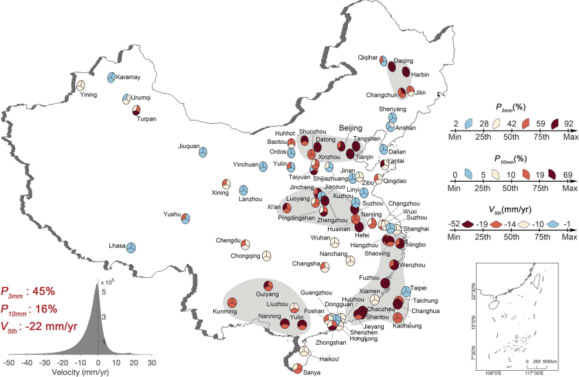 权威期刊《科学》杂志发表论文,截至2022年,中国有45%的城市每年的下沉速度超过3毫米。这些城市的人口占全国人口的29%。其中,16%的城市土地每年“快速”下沉超过10毫米。